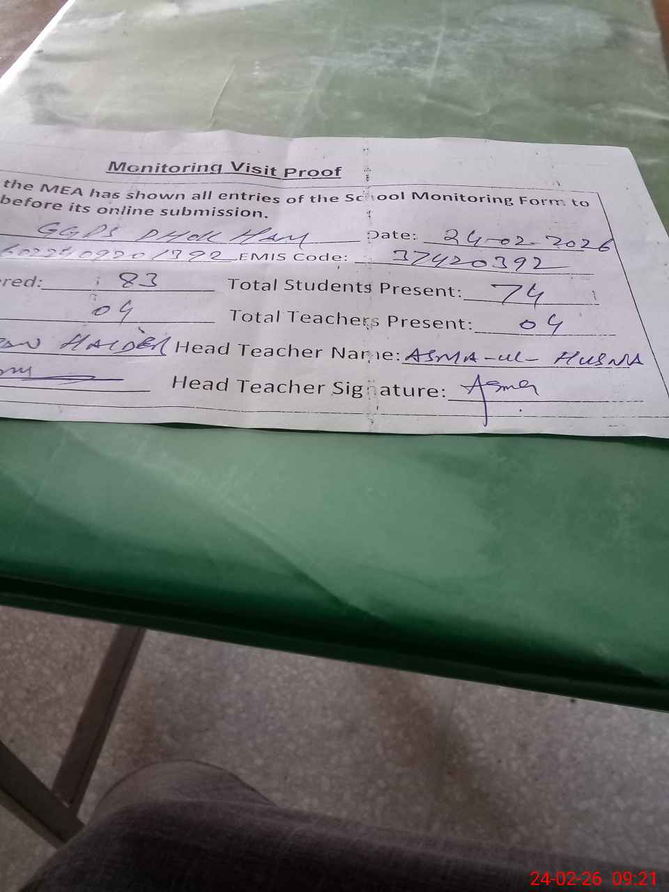 | Attendance Register | Head Teacher | MEA with School | Visit Proof |