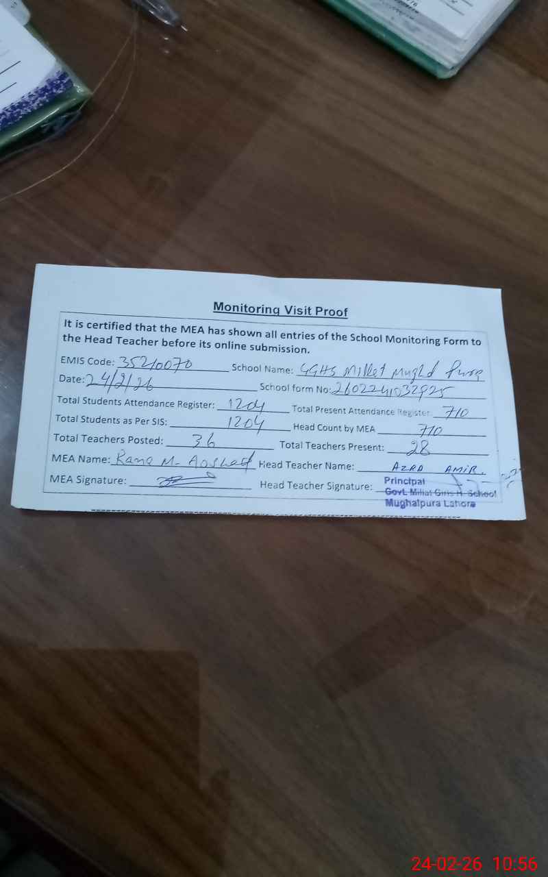 | EMIS Code: 35210070 | Name of School: GGHS MILLAT MUGHAL PURA LAHORE | |||