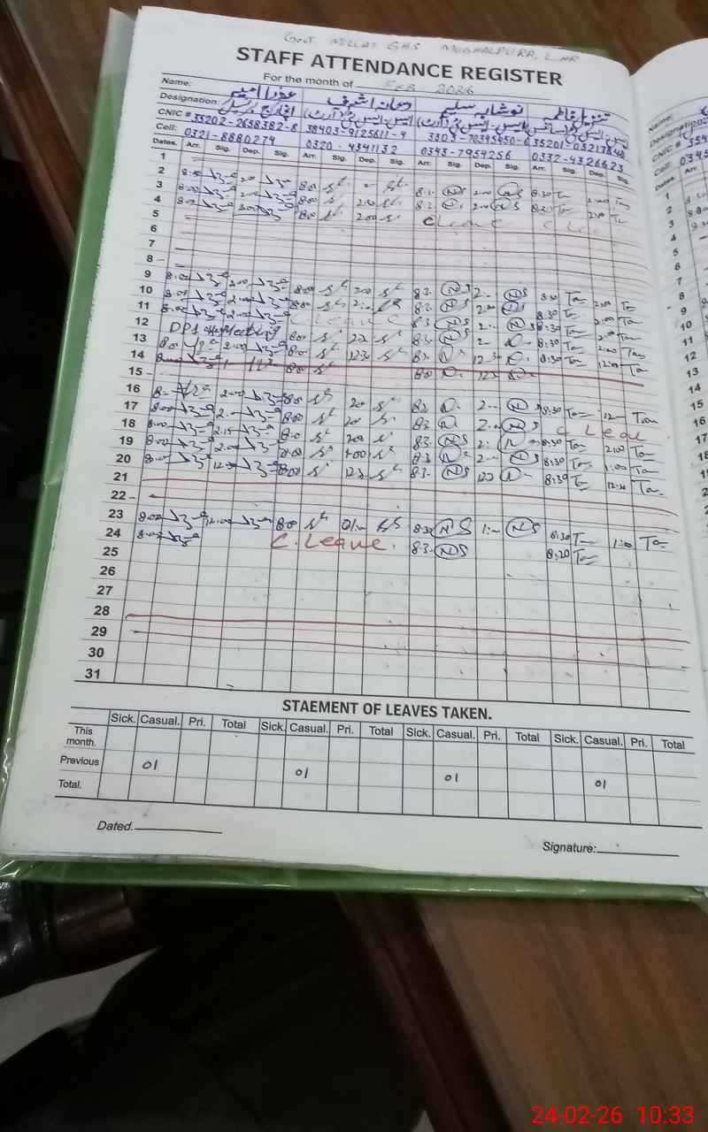 | 00**** | Sa**** Kh**** | CHOUKIDSR | 0 | 0 | 0 | 0 | 0 | 0 | 0 | 0 | 0 | Absent (Un-Authorized) | |