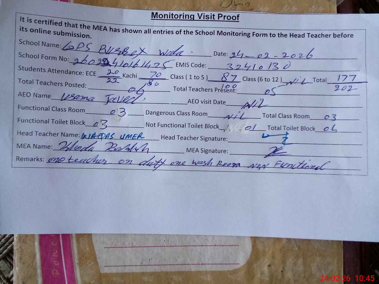 | Remarks (Use Separate Page if Required): one teacher on duty one wash room non functional over all cleanliness good | |||||
