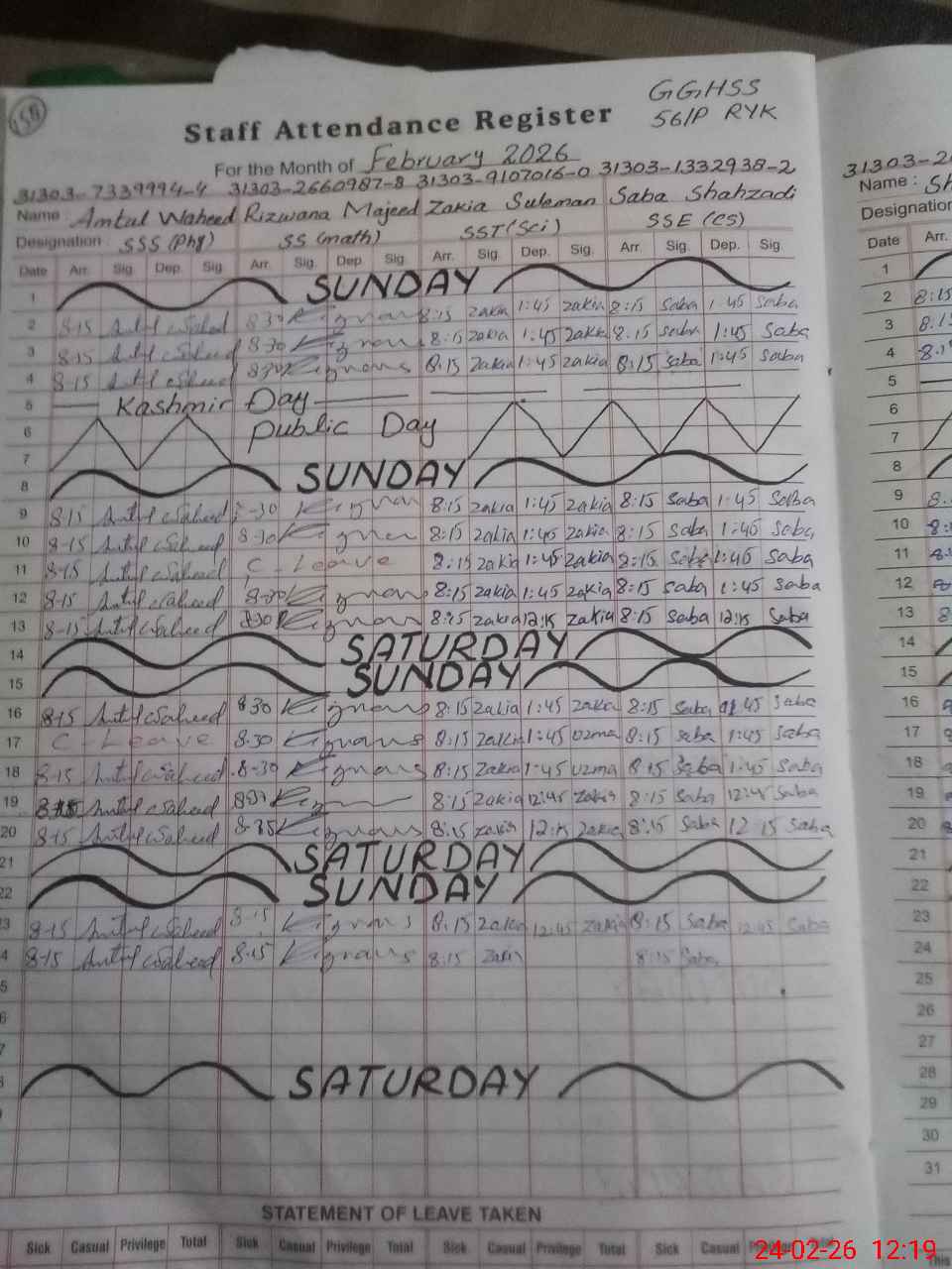 | CNIC | Full Name | Designation | R/C | Absence During Last Calender Month |