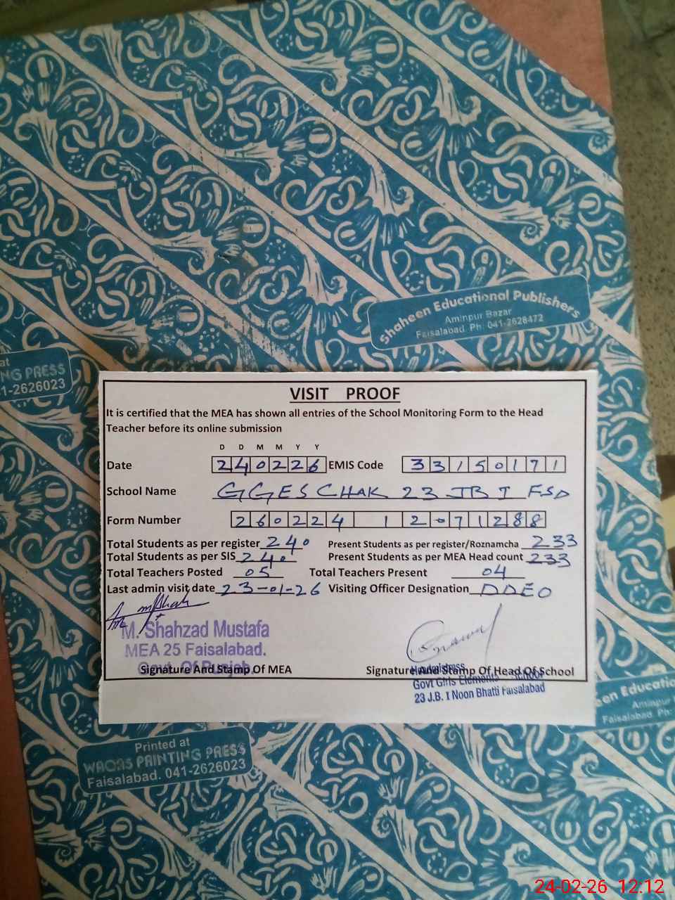 | EMIS Code: 33150171 | Name of School: GGES CHAK 23 JB I | |||