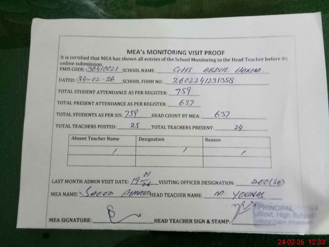 | Attendance Register | Head Teacher | MEA with School | Visit Proof |