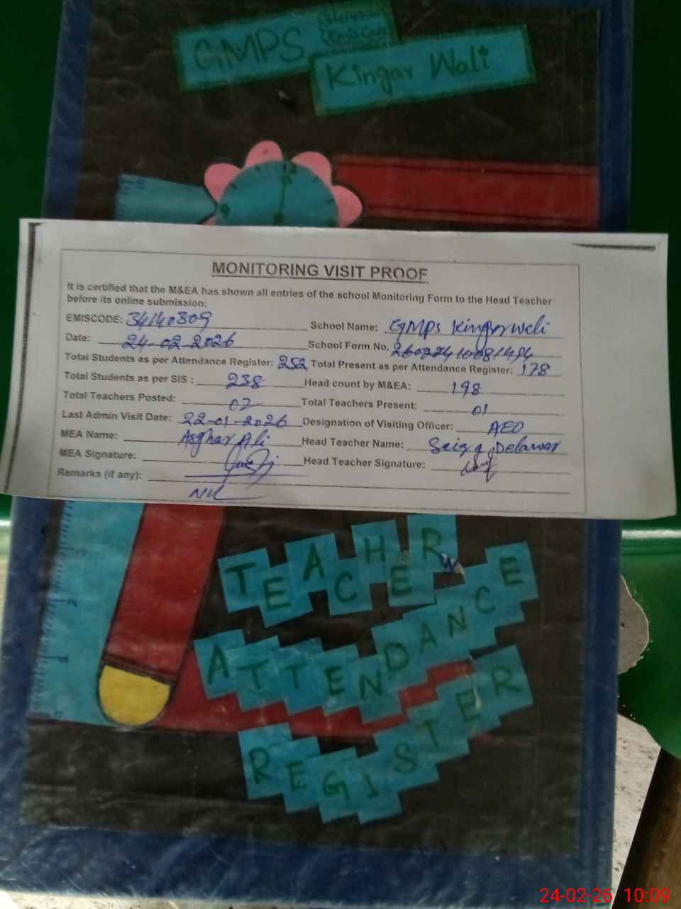 | Attendance Register | Head Teacher | MEA with School | Visit Proof |