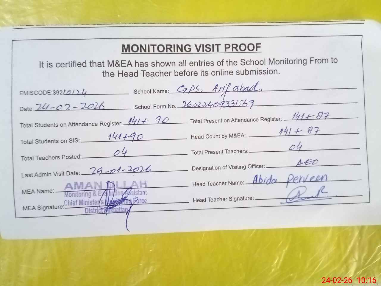 | EMIS Code: 39210124 | Name of School: GPS ARIF ABAD | |||