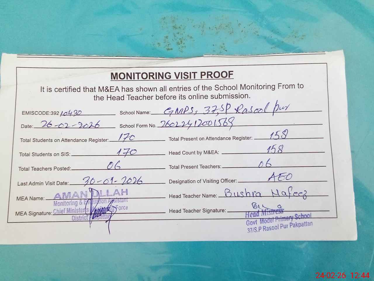 | Attendance Register | Head Teacher | MEA with School | Visit Proof |