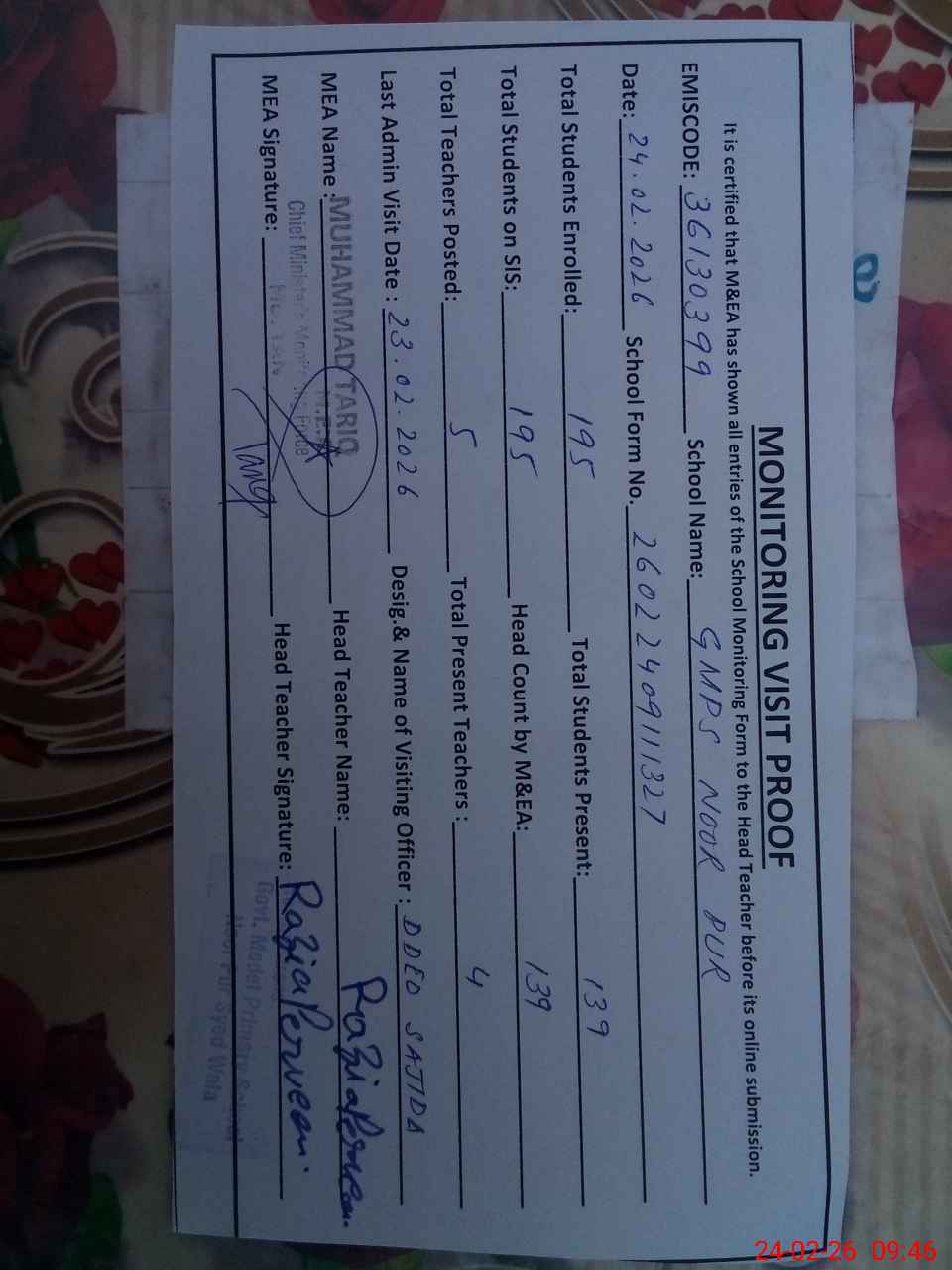 | Certified that this School was Inspected by the Undersigned MEA/DMO Today and the Information Stated Above is as Per Record. | |||||