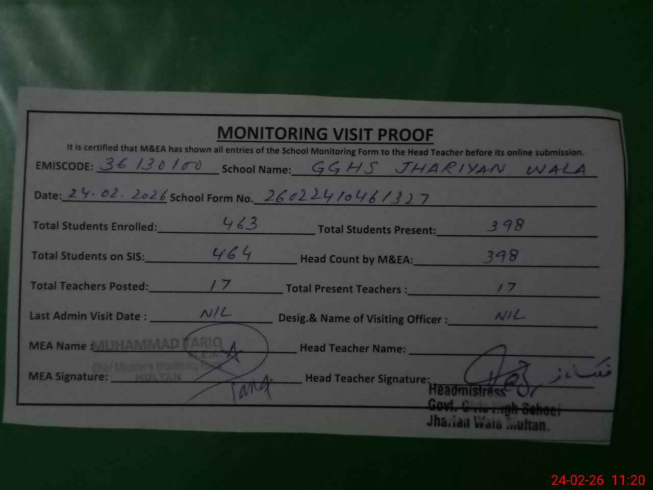 | Attendance Register | Head Teacher | MEA with School | Visit Proof |