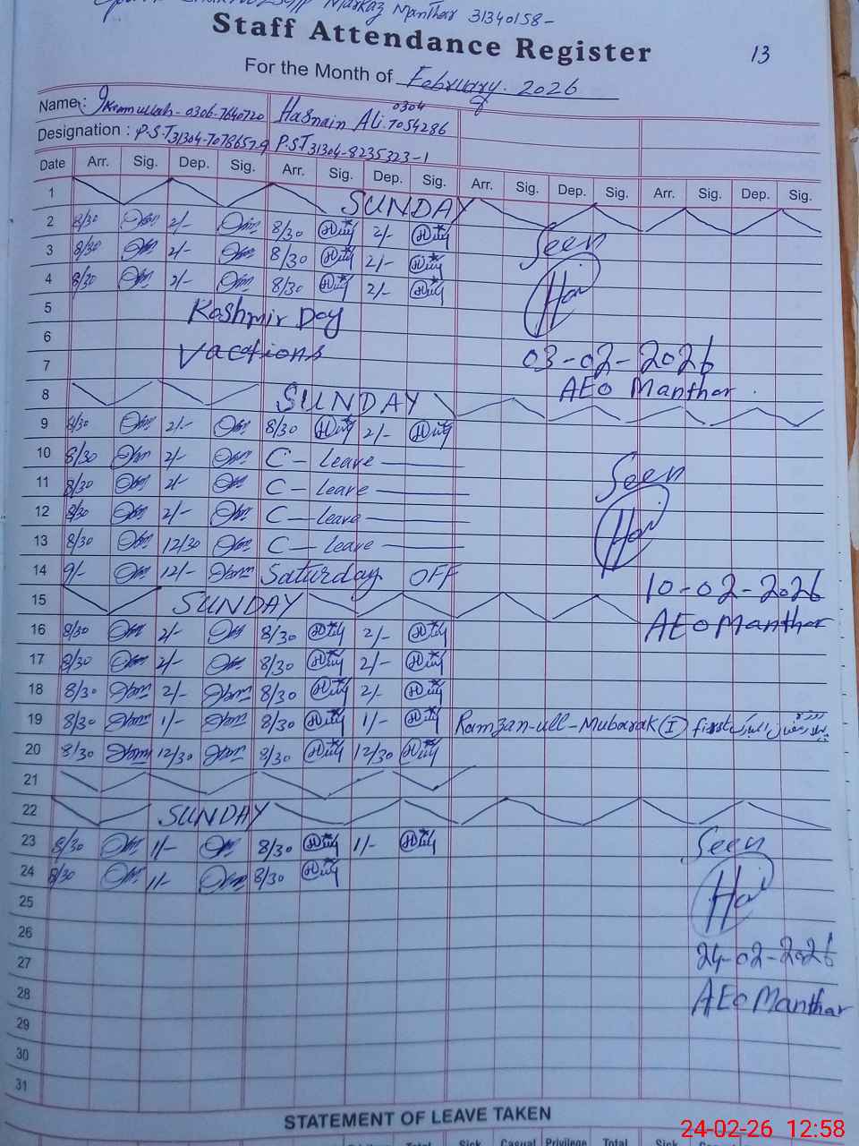 | CNIC | Full Name | Designation | R/C | Absence During Last Calender Month |