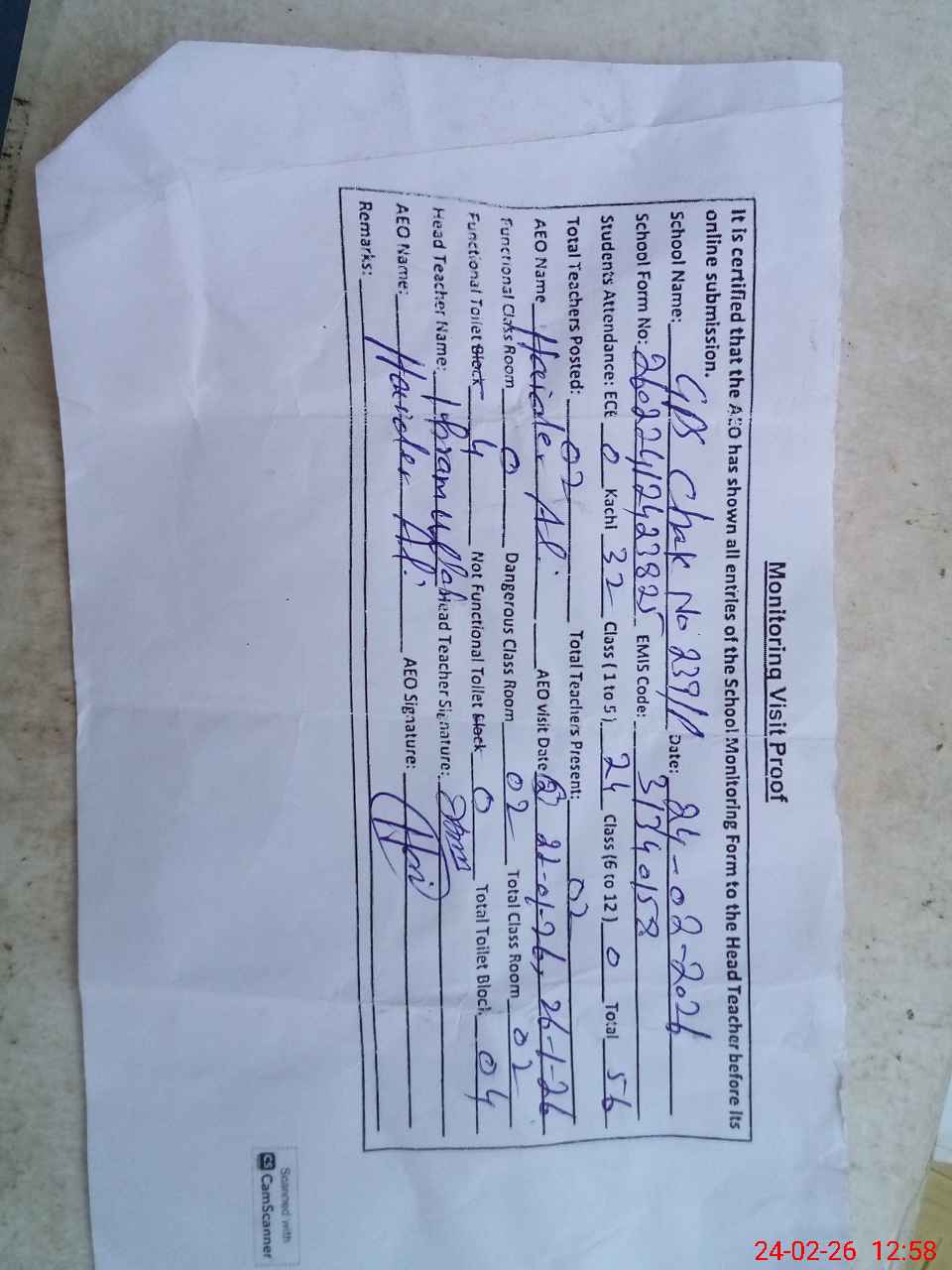 | Attendance Register | Head Teacher | MEA with School | Visit Proof |
