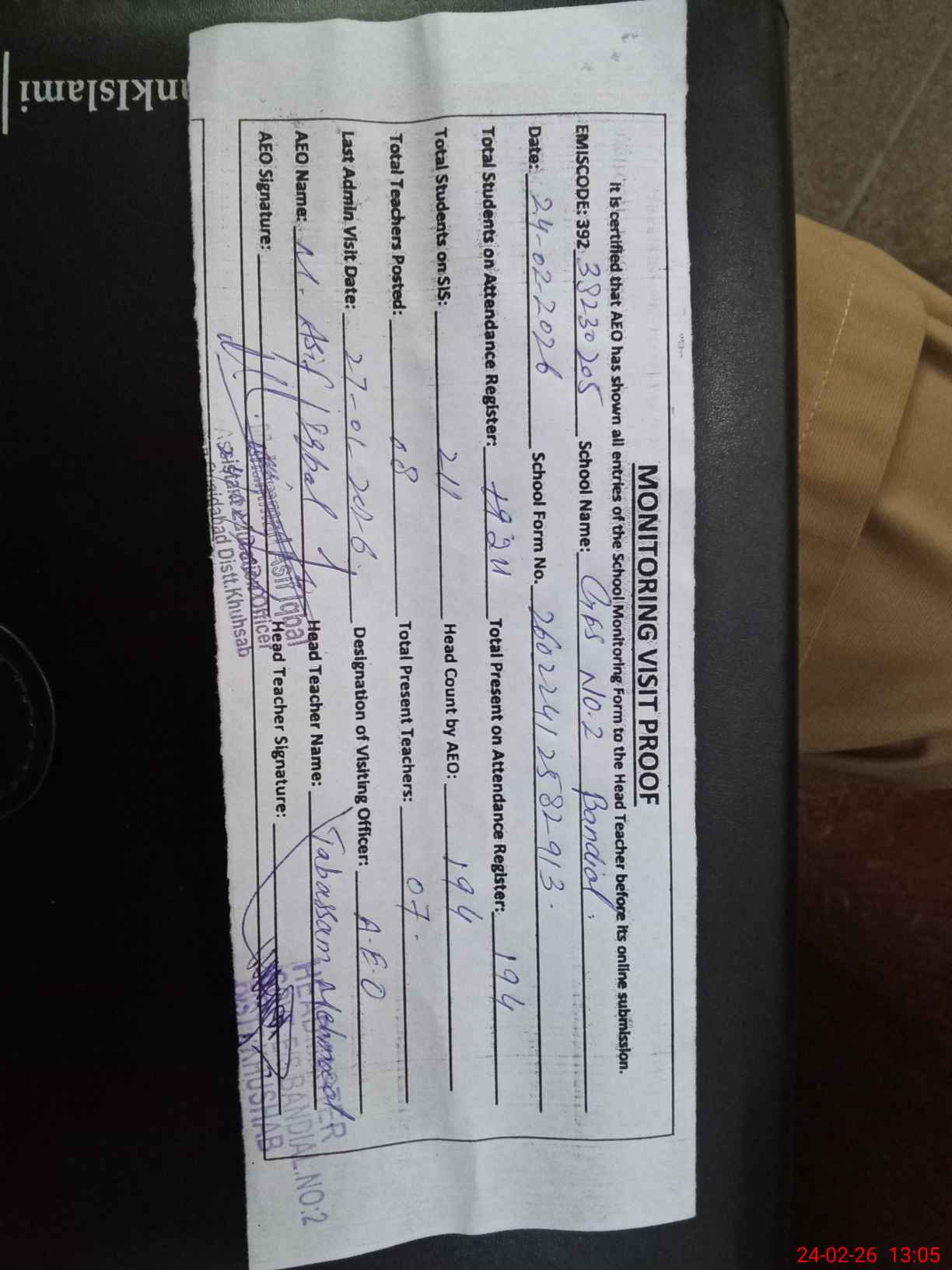 | Certified that this School was Inspected by the Undersigned MEA/DMO Today and the Information Stated Above is as Per Record. | |||||
