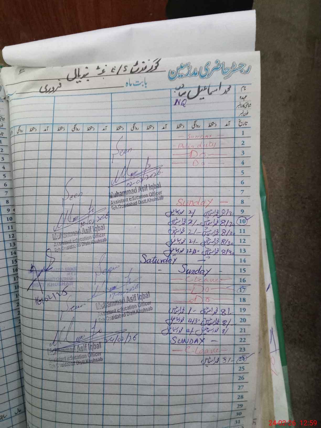 | CNIC | Full Name | Designation | R/C | Absence During Last Calender Month |