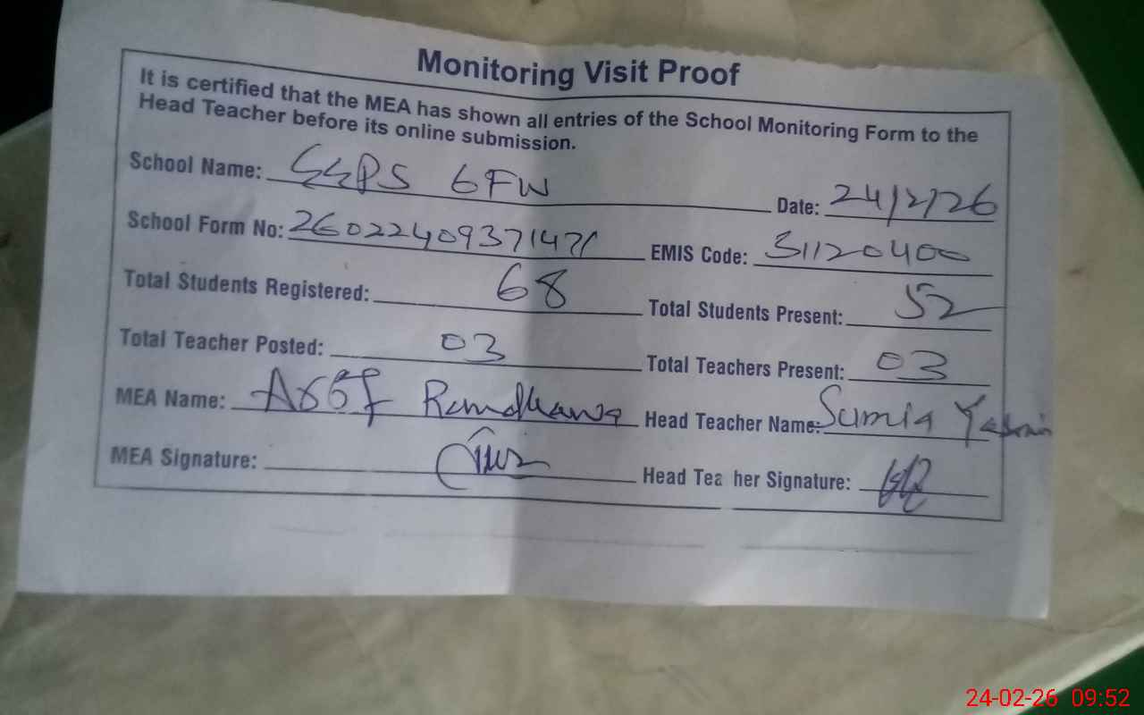 | EMIS Code: 31120400 | Name of School: GGPS CHAK NO.6/FW | |||