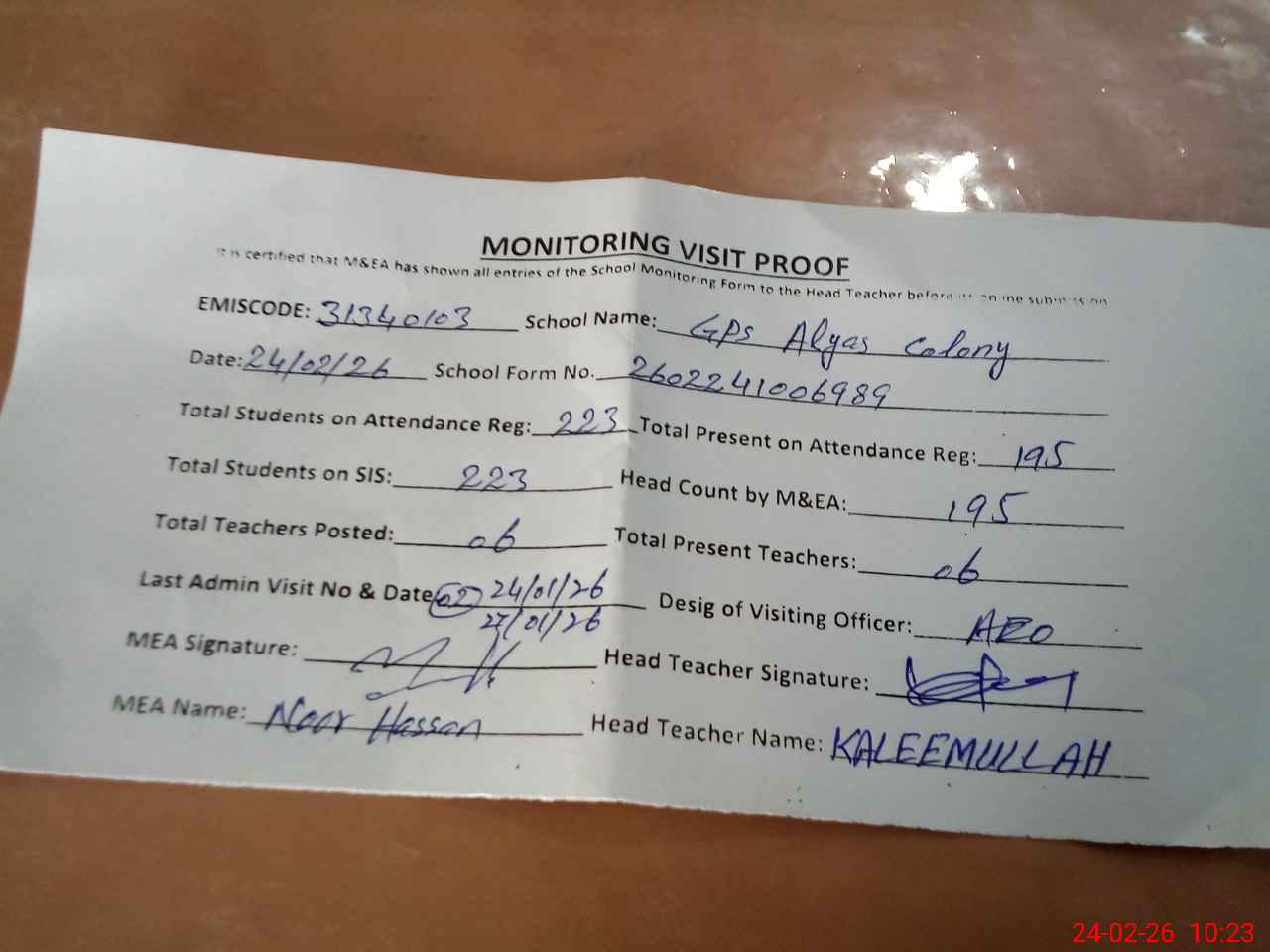 | EMIS Code: 31340103 | Name of School: GPS ALYAS COLONY | |||