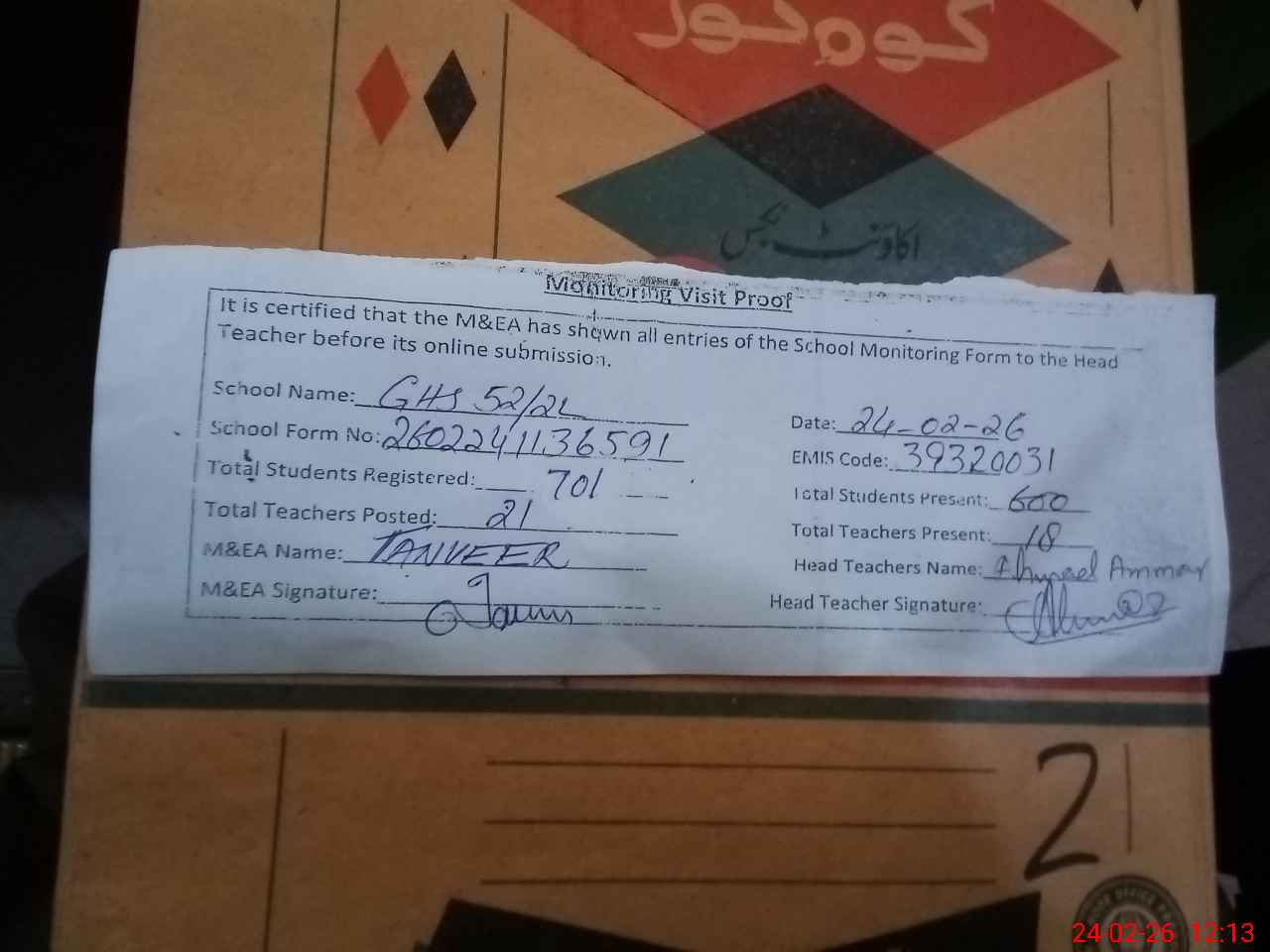 | EMIS Code: 39320031 | Name of School: GHS CHAK NO. 52/2-L OKARA | |||