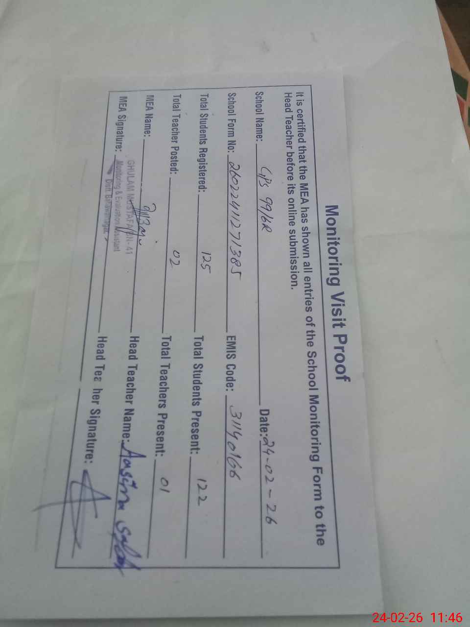 | Attendance Register | Head Teacher | MEA with School | Visit Proof |
