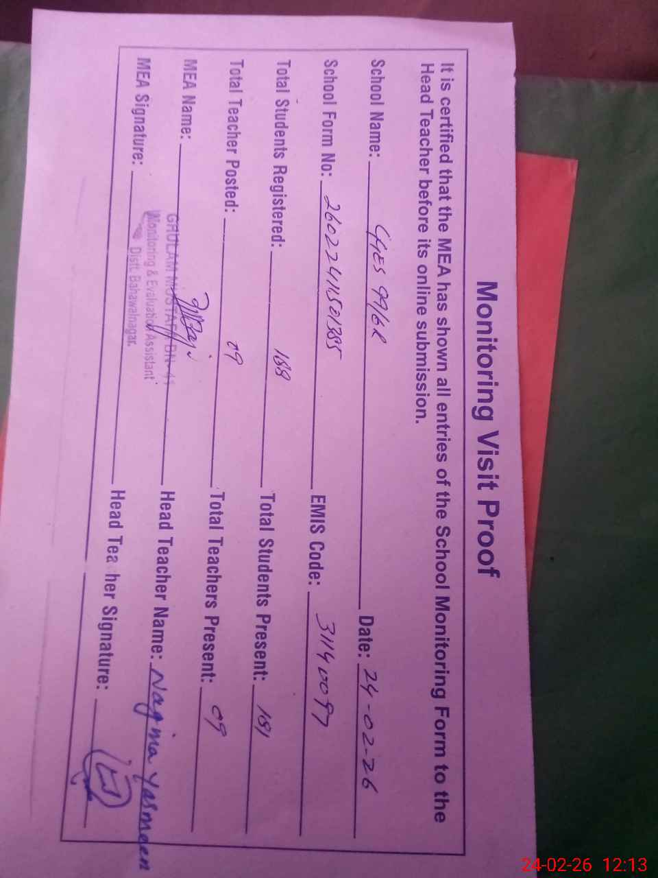 | Attendance Register | Head Teacher | MEA with School | Visit Proof |
