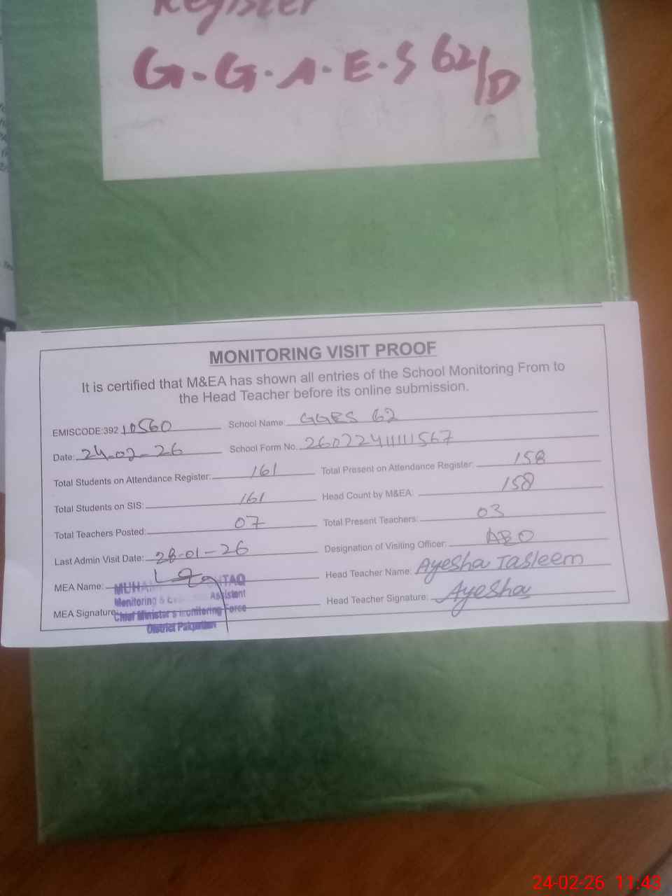 | Attendance Register | Head Teacher | MEA with School | Visit Proof |