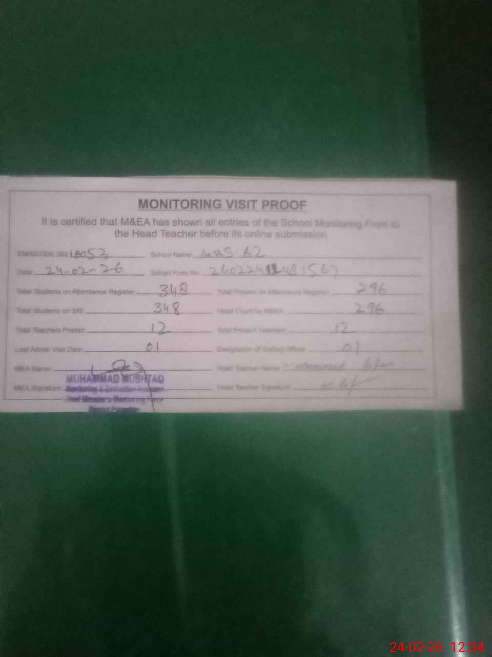 | Attendance Register | Head Teacher | MEA with School | Visit Proof |