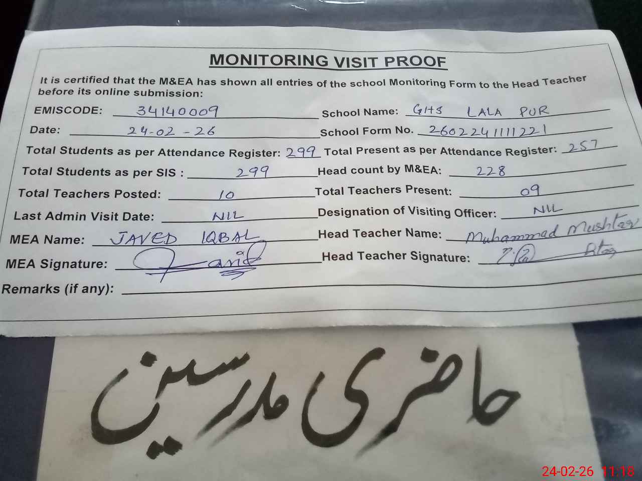 | EMIS Code: 34140009 | Name of School: GHS LALA PUR | |||