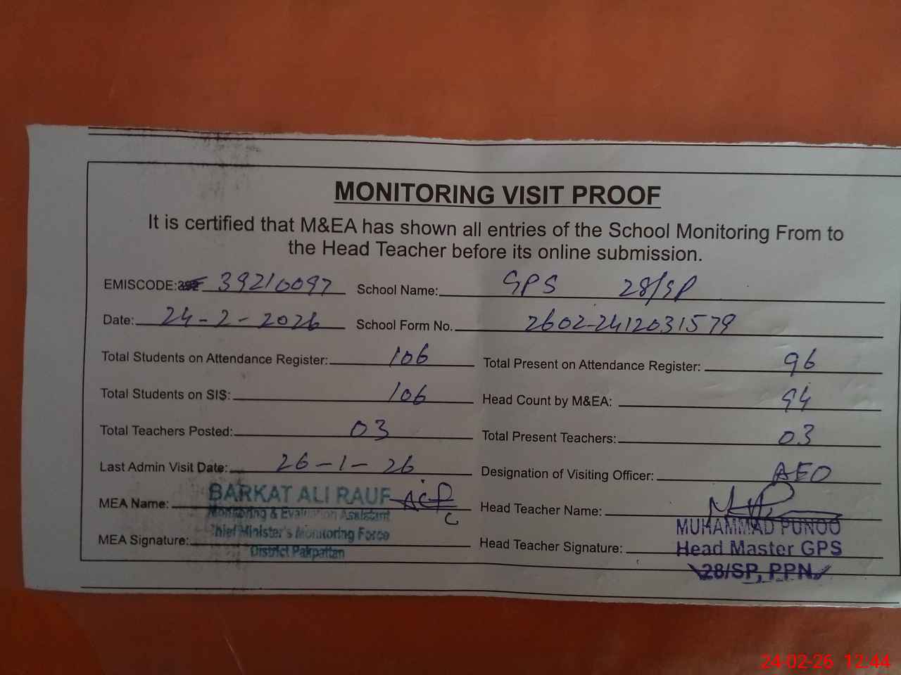 | Attendance Register | Head Teacher | MEA with School | Visit Proof |