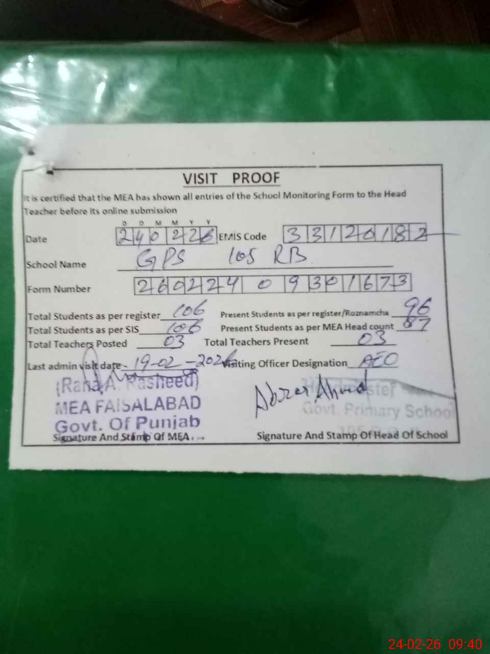 | EMIS Code: 33120182 | Name of School: GPS CHAK NO 105 RB II | |||
