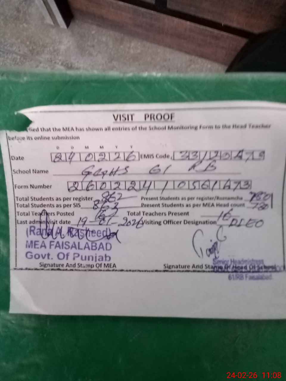 | Certified that this School was Inspected by the Undersigned MEA/DMO Today and the Information Stated Above is as Per Record. | |||||