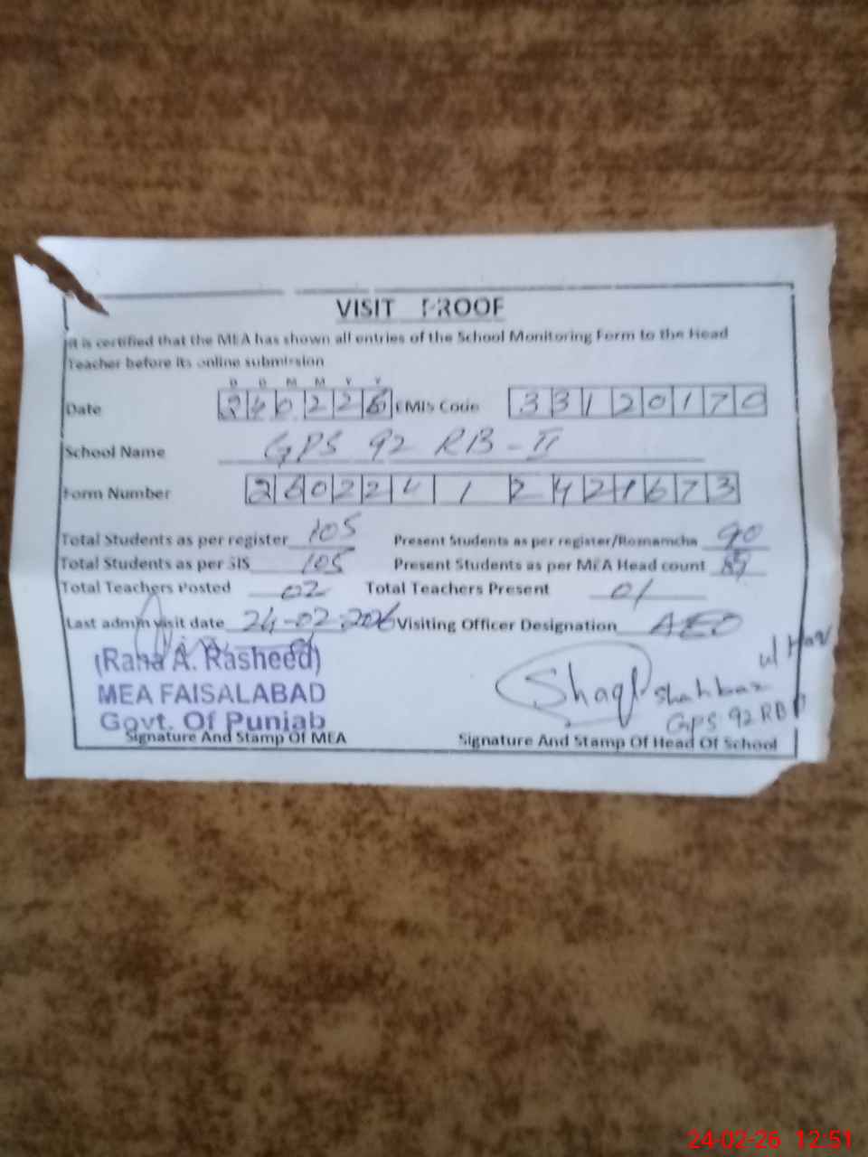| Attendance Register | Head Teacher | MEA with School | Visit Proof |