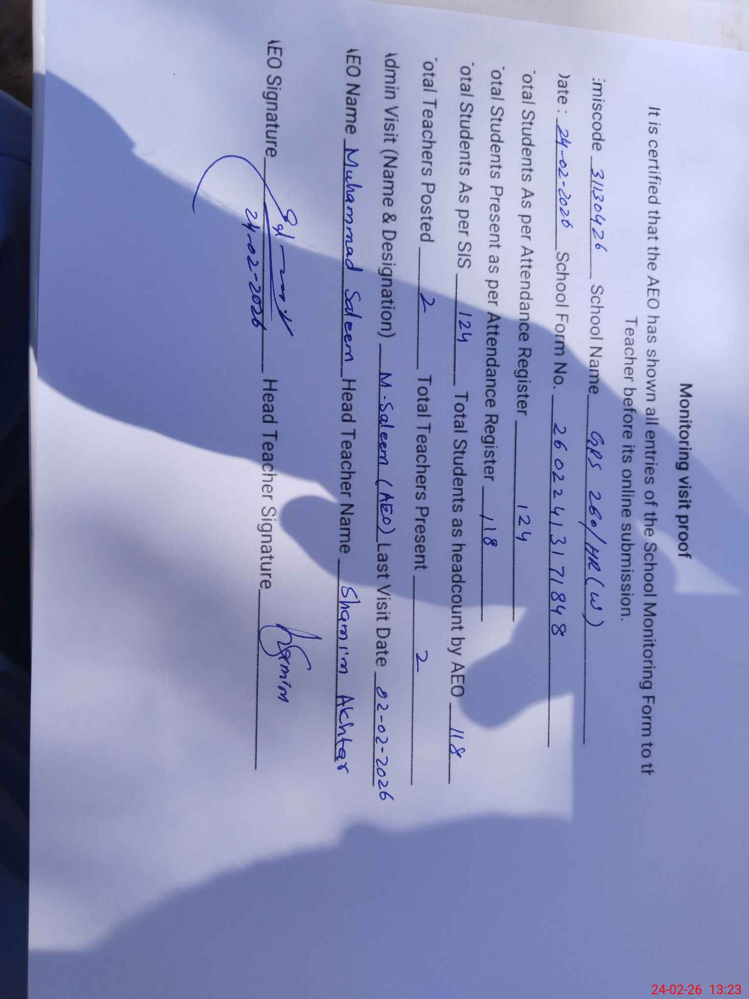 | EMIS Code: 31130426 | Name of School: GPS CHAK NO.260/HR WEST | |||