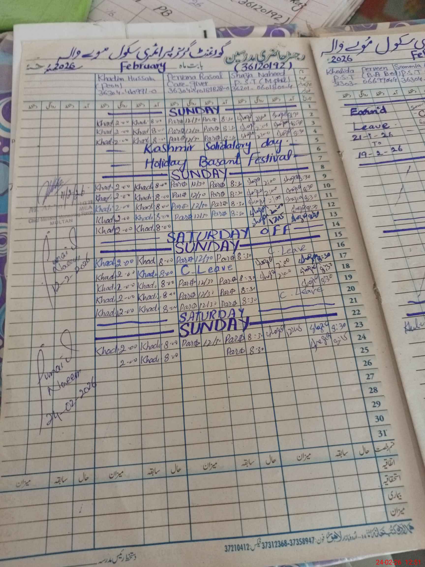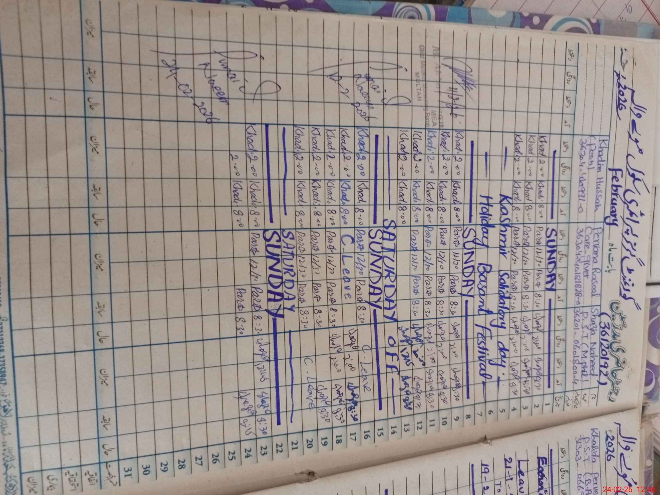 | Leave | Duty | Absent | Maternity | Medical | Ex- Pak |