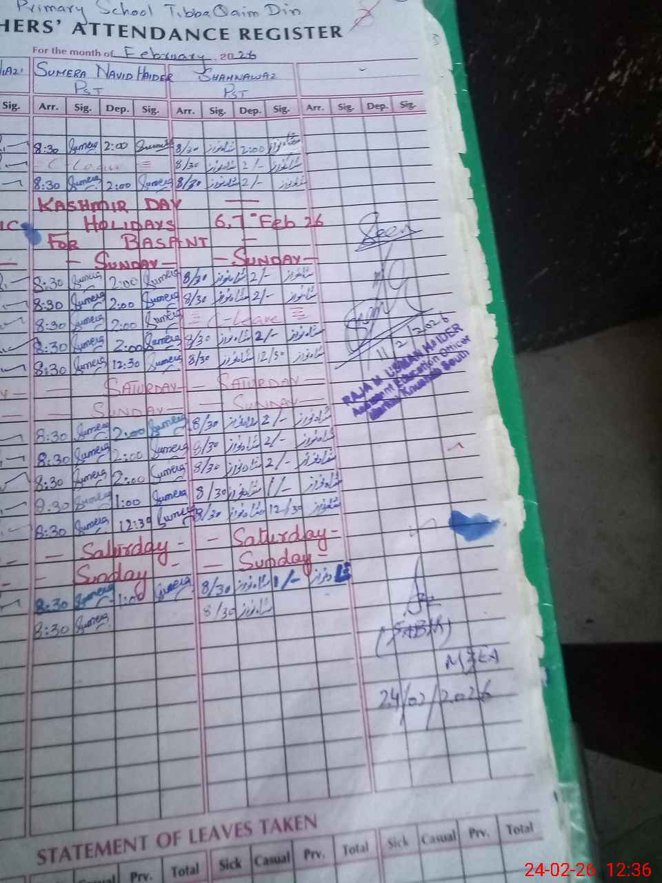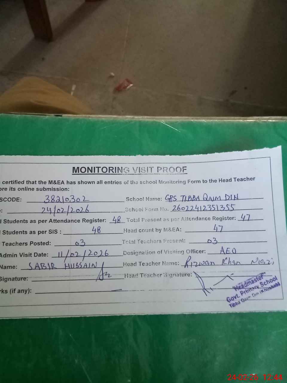 | Remarks (Use Separate Page if Required): no teacher absent total students on register 48 total students on SiS 48 last admin visit by AEO on 11 Feb 2026 | |||||