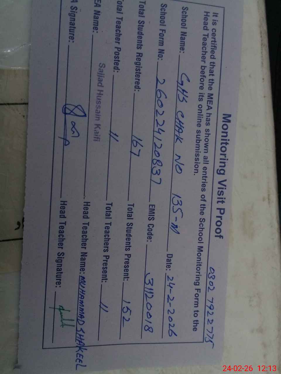 | EMIS Code: 31120018 | Name of School: GHS CHAK NO. 135 MURD | |||