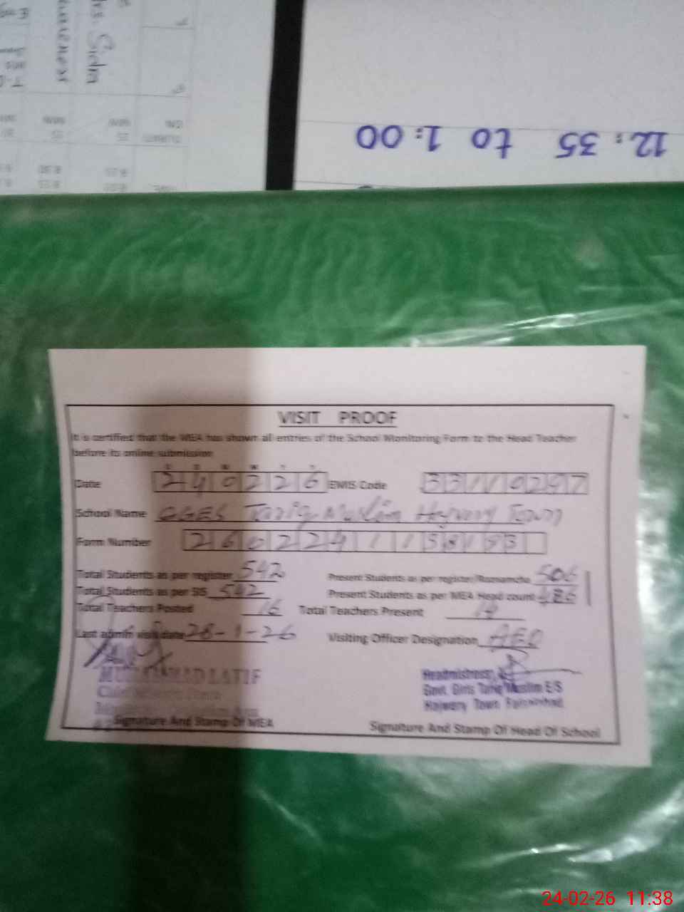 | Certified that this School was Inspected by the Undersigned MEA/DMO Today and the Information Stated Above is as Per Record. | |||||