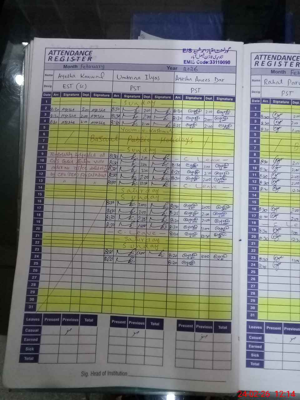 | CNIC | Full Name | Designation | R/C | Absence During Last Calender Month |