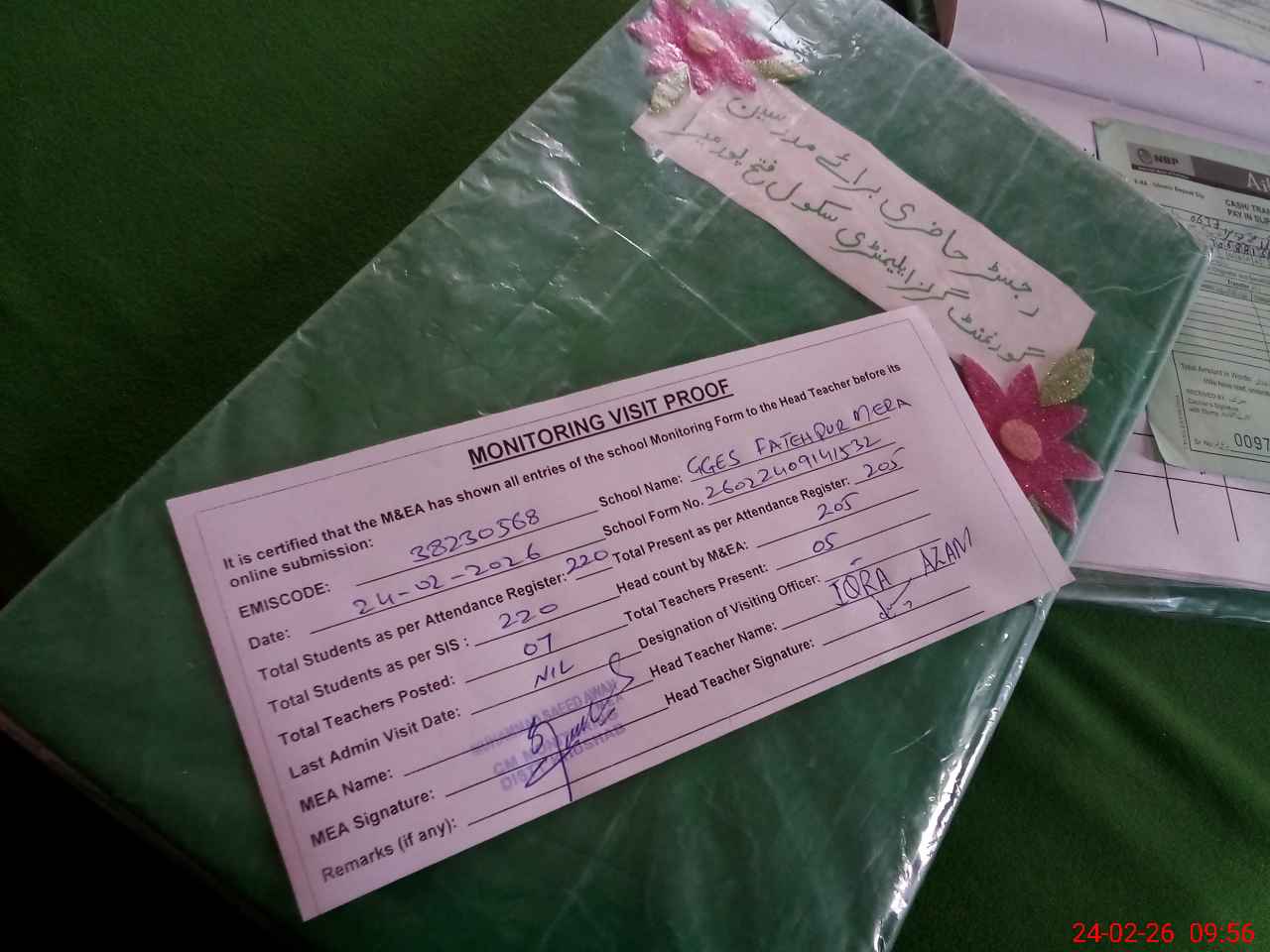 | Attendance Register | Head Teacher | MEA with School | Visit Proof |