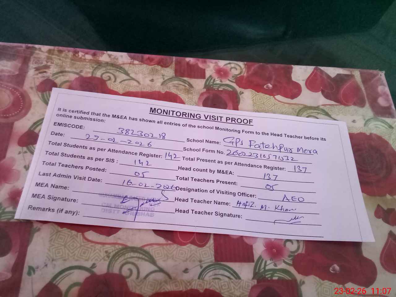 | Remarks (Use Separate Page if Required): Students on SIS QTY 142 Last admin visit On 16 February 2026 by AEO | |||||