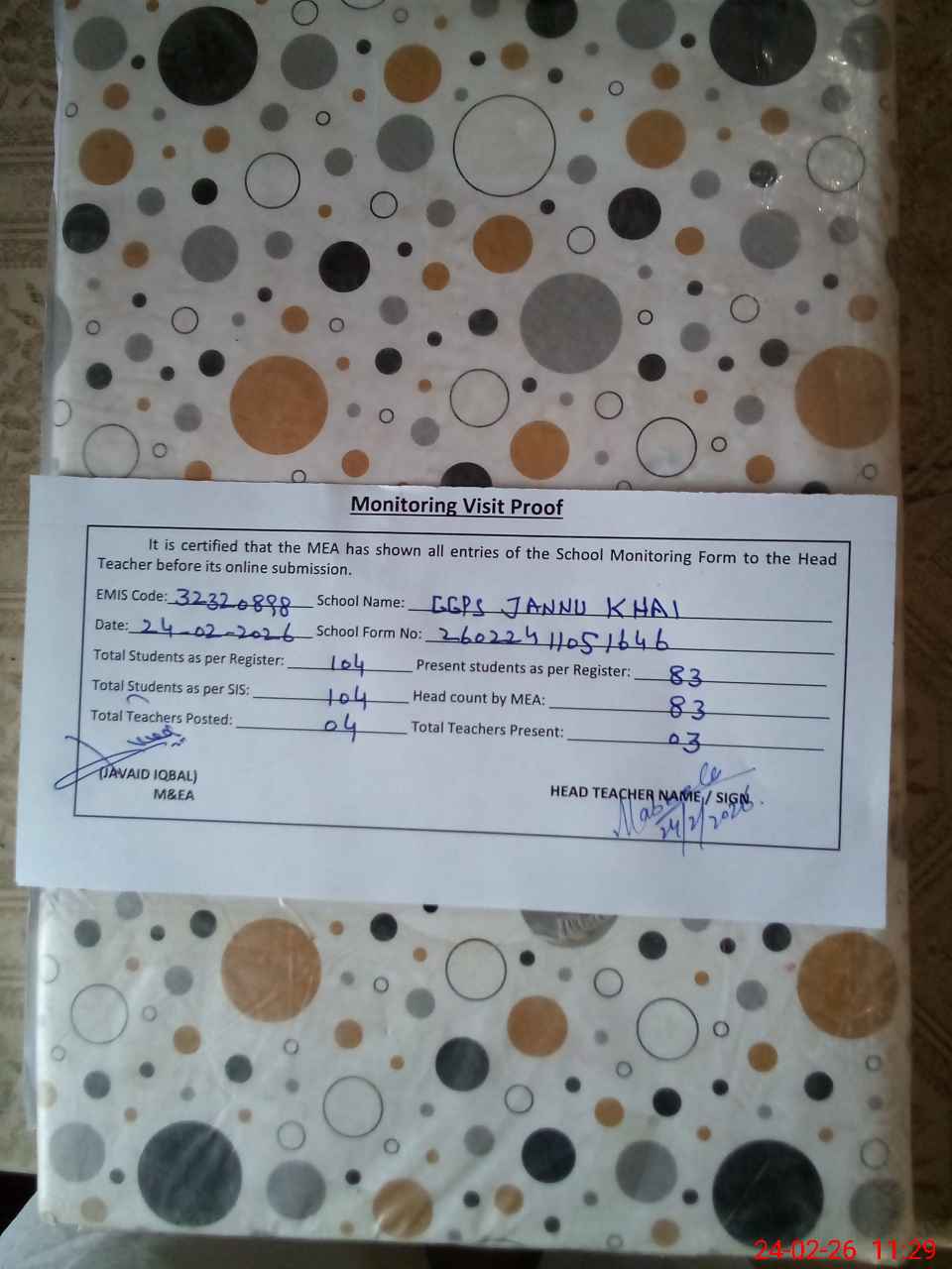 | Attendance Register | Head Teacher | MEA with School | Visit Proof |