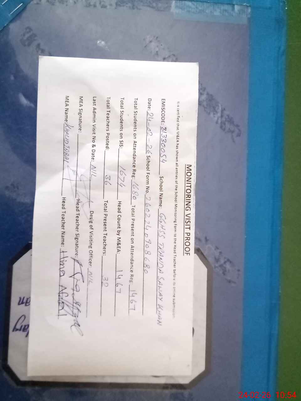 | Attendance Register | Head Teacher | MEA with School | Visit Proof |