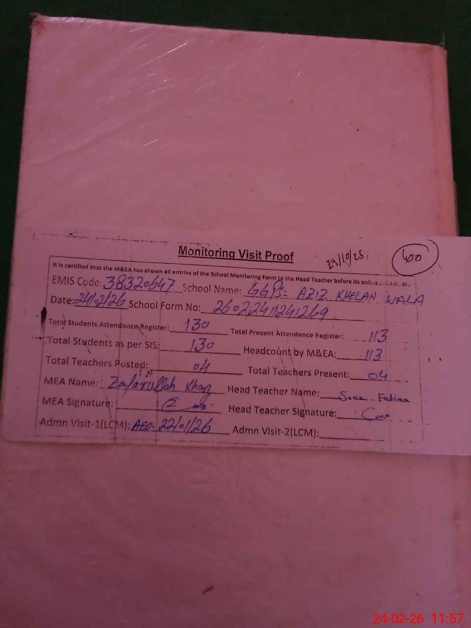 | Attendance Register | Head Teacher | MEA with School | Visit Proof |