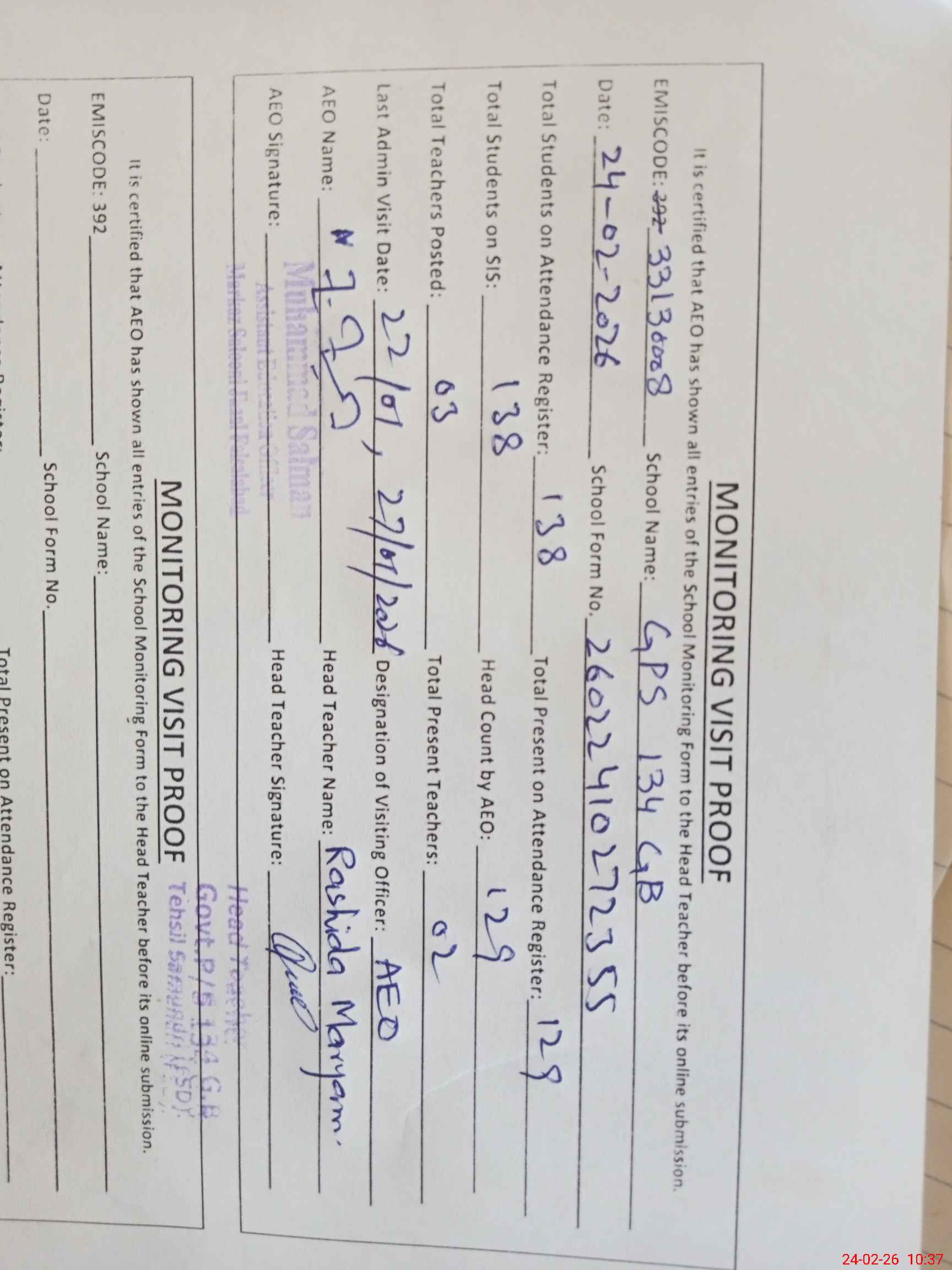 | Monitoring Date: 24-02-2026 | Start Time: 24-02-2026 08:54 AM | End Time: 24-02-2026 10:40 AM | Name of MEA: Mu**** Sa**** | |