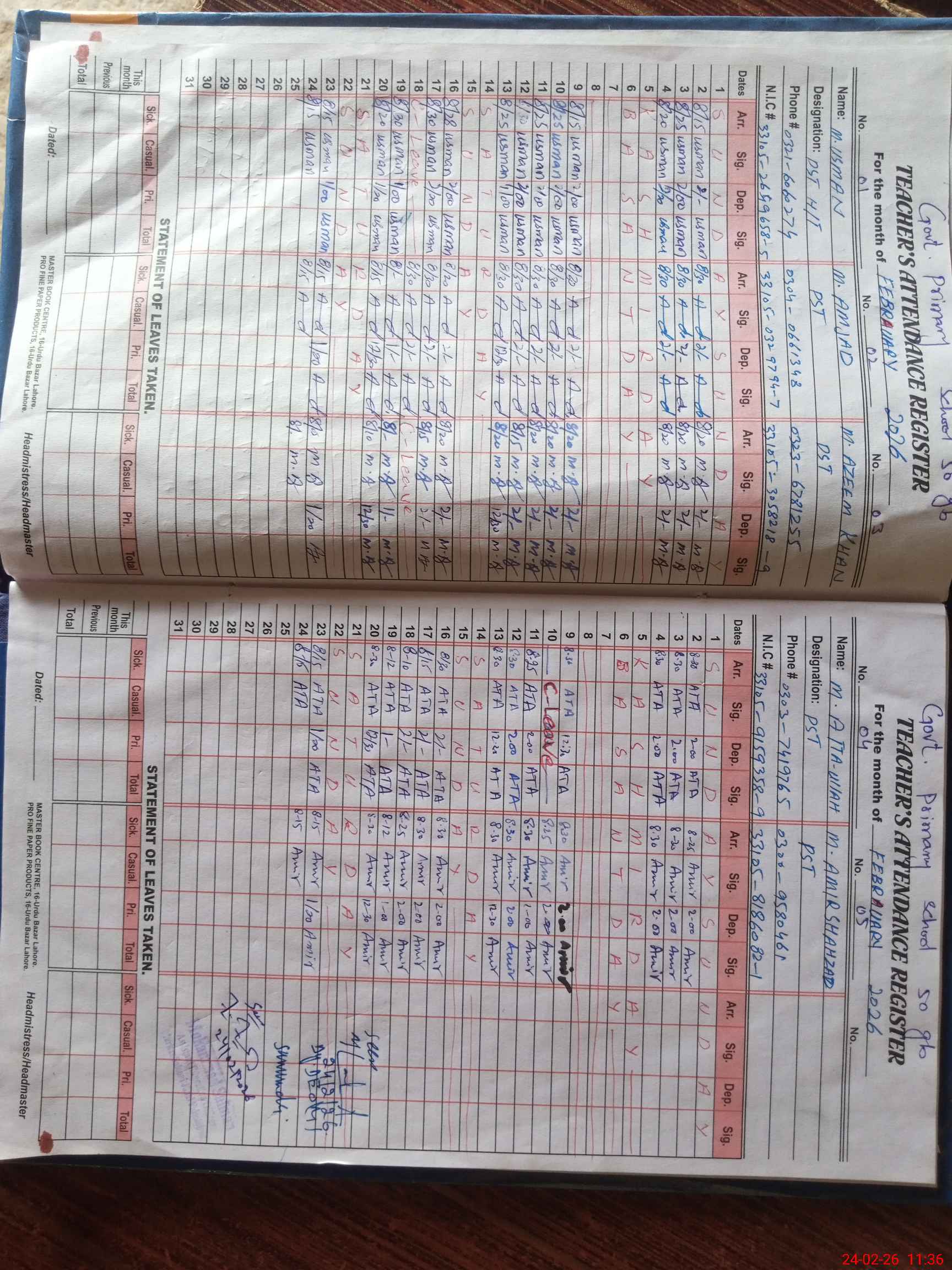 | CNIC | Full Name | Designation | R/C | Absence During Last Calender Month |