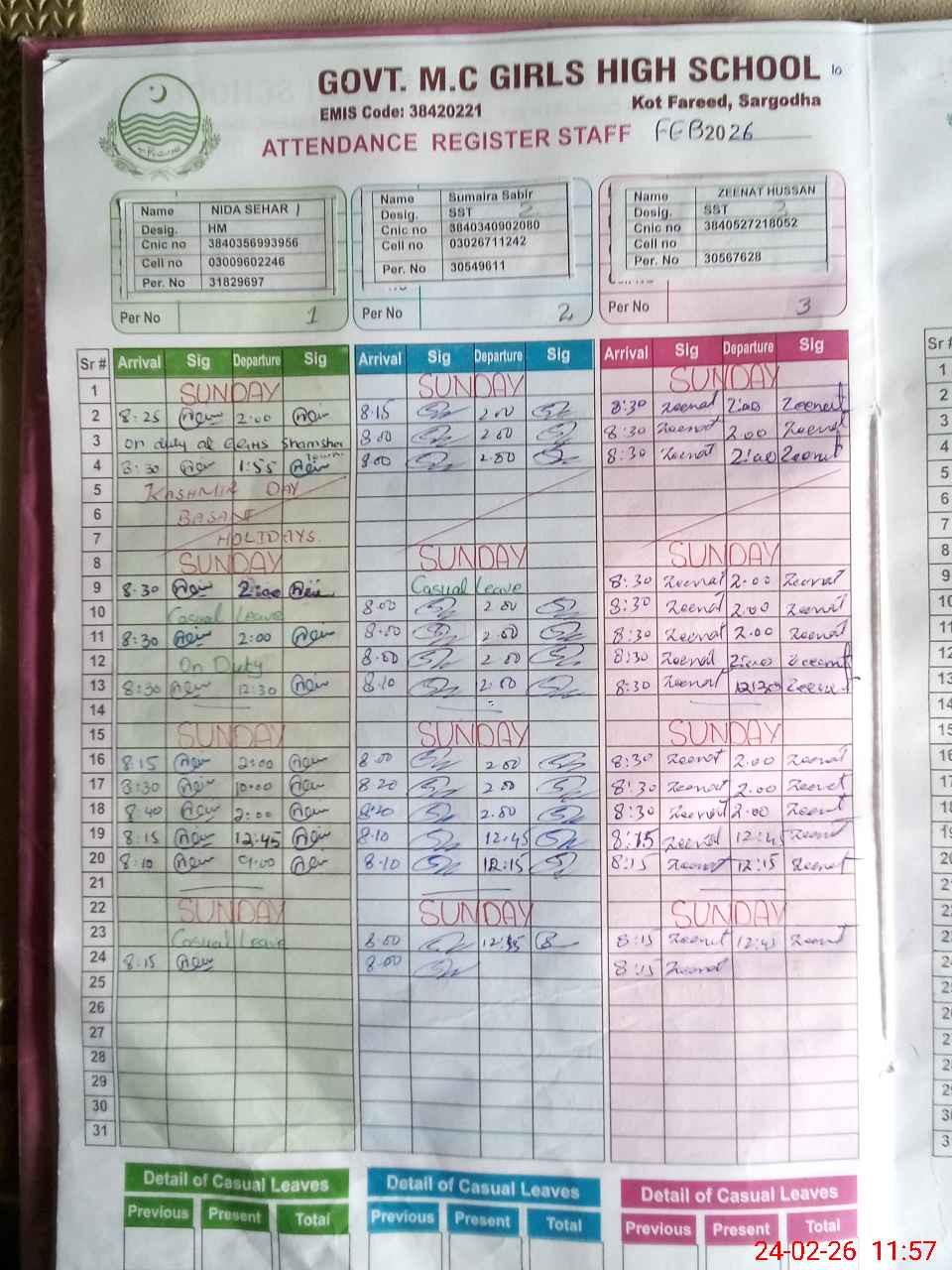 | CNIC | Full Name | Designation | R/C | Absence During Last Calender Month |