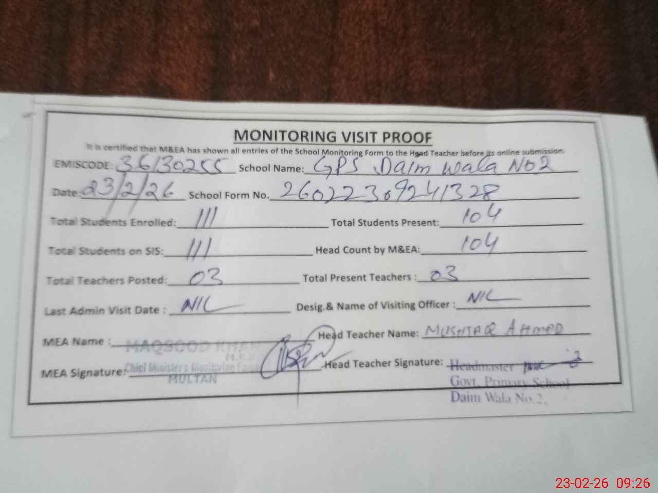 | Attendance Register | Head Teacher | MEA with School | Visit Proof |