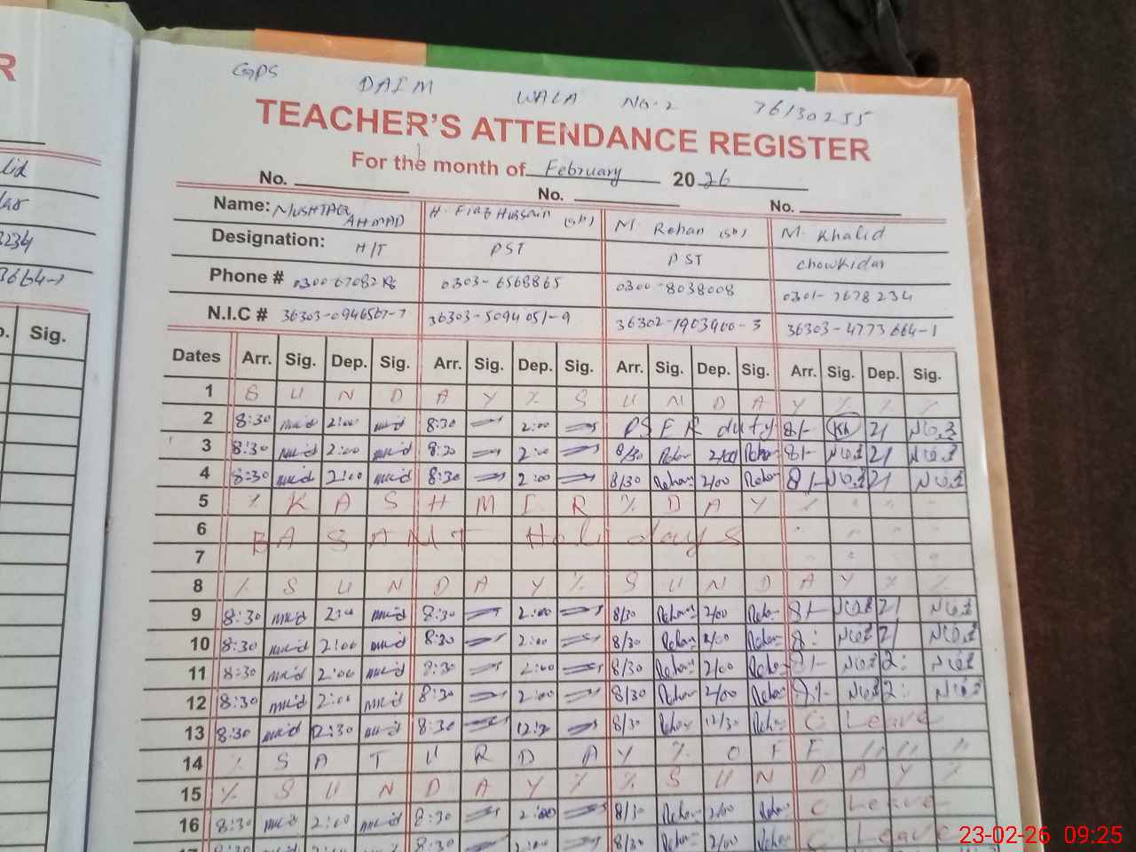 | Name: Mu**** Ah**** Designation: (School Headmaster's/Headmistress's) PST/PTC/JV Phone/Cell Number: 03**** |