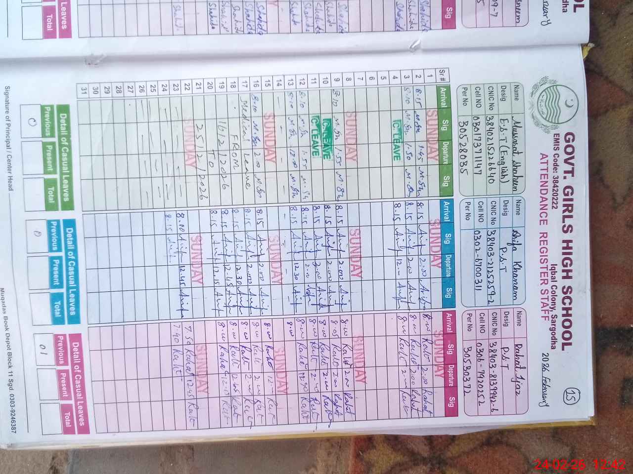 | CNIC | Full Name | Designation | R/C | Absence During Last Calender Month |