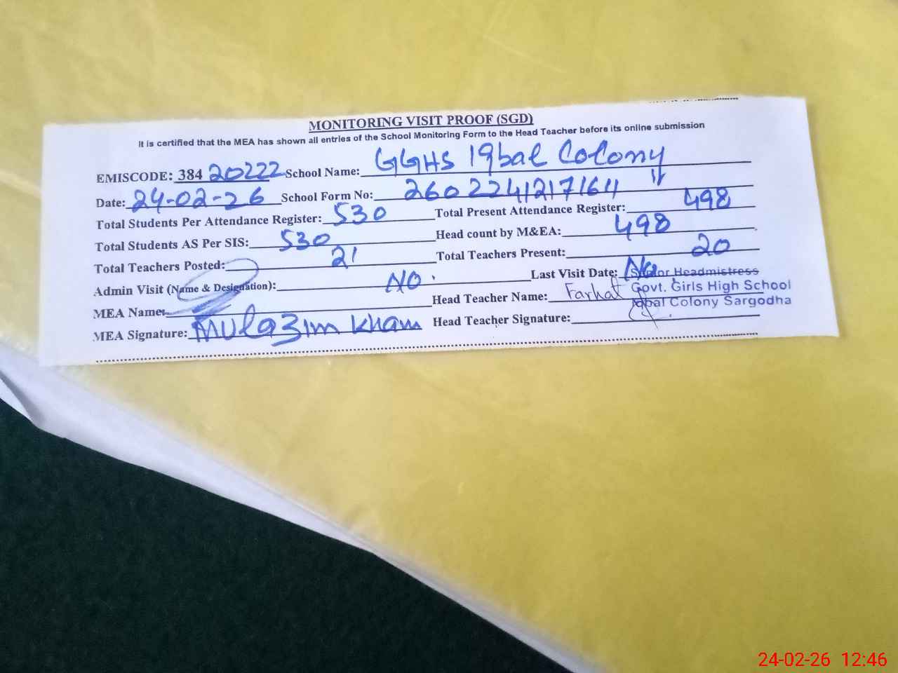 | EMIS Code: 38420222 | Name of School: GGHS IQBAL COLONY SARGODHA | |||