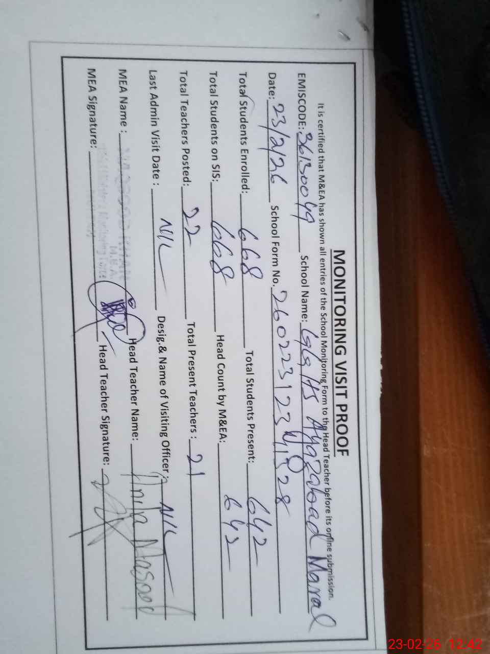 | Attendance Register | Head Teacher | MEA with School | Visit Proof |