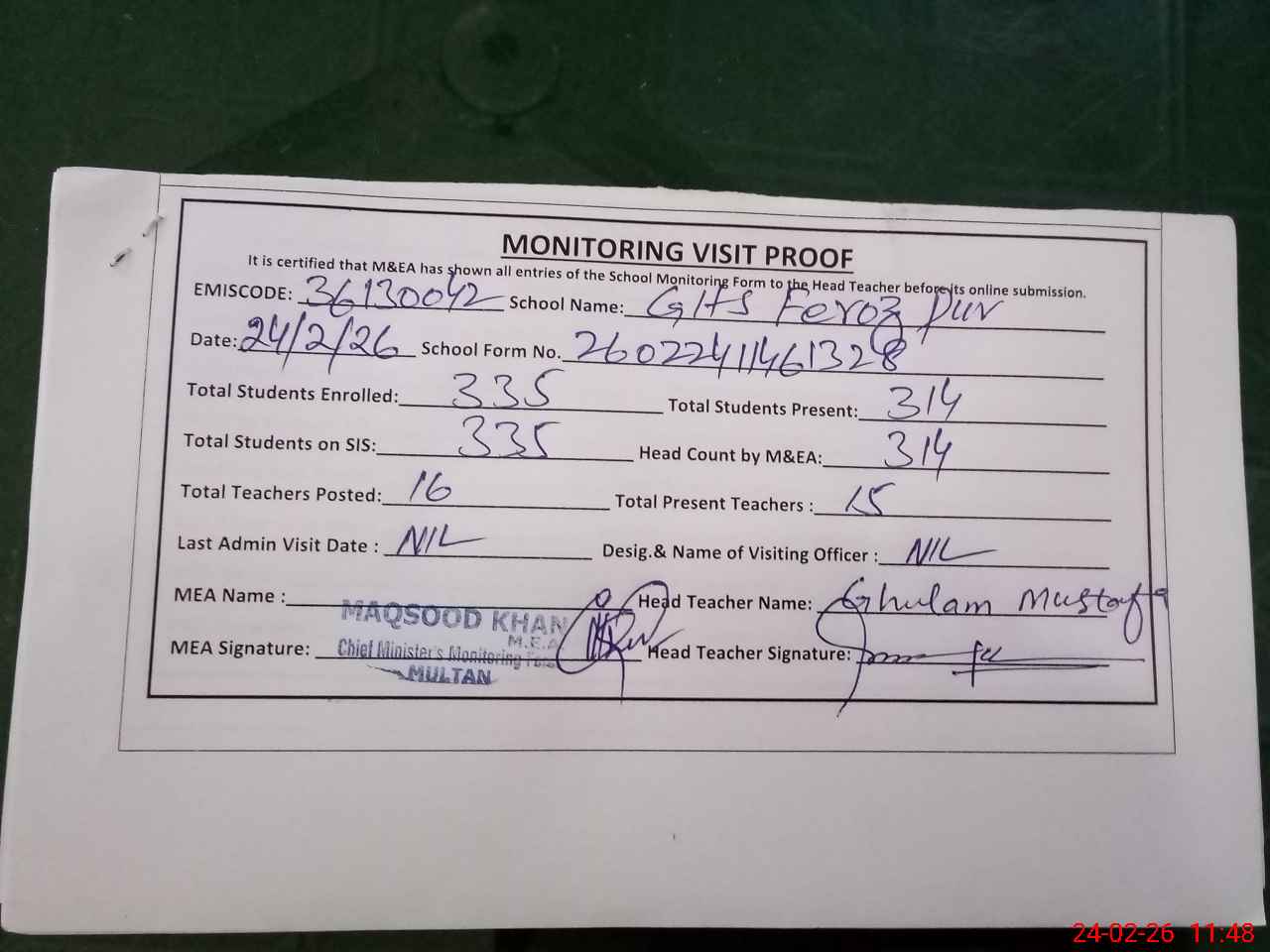 | EMIS Code: 36130042 | Name of School: GHS FEROZ PUR MOUZA FEROZEPUR P/O SKINDRA ABAD TEH. & DISTT. MULTAN | |||