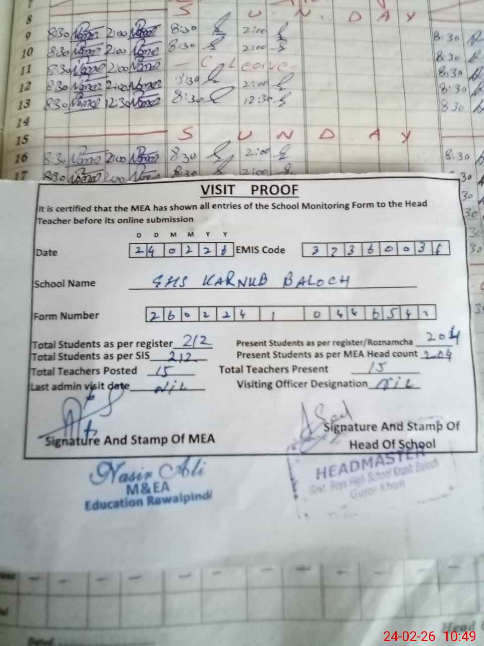 | Certified that this School was Inspected by the Undersigned MEA/DMO Today and the Information Stated Above is as Per Record. | |||||