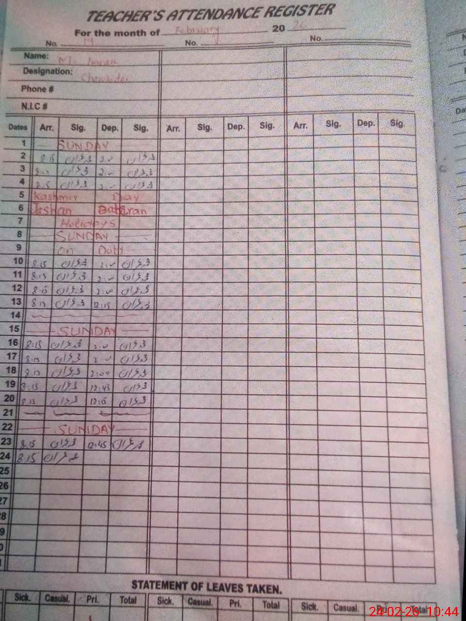 | CNIC | Full Name | Designation | R/C | Absence During Last Calender Month |